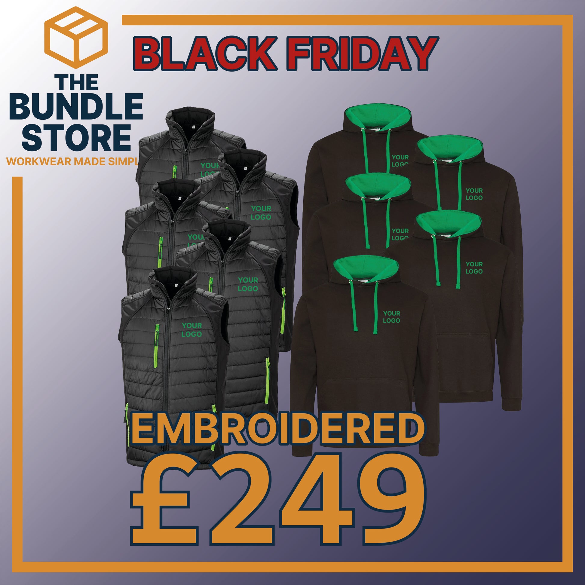 This Black Friday, upgrade your team’s outerwear with a premium mixed bundle of padded bodywarmers and contrast hoodies — all expertly embroidered with your company logo.
